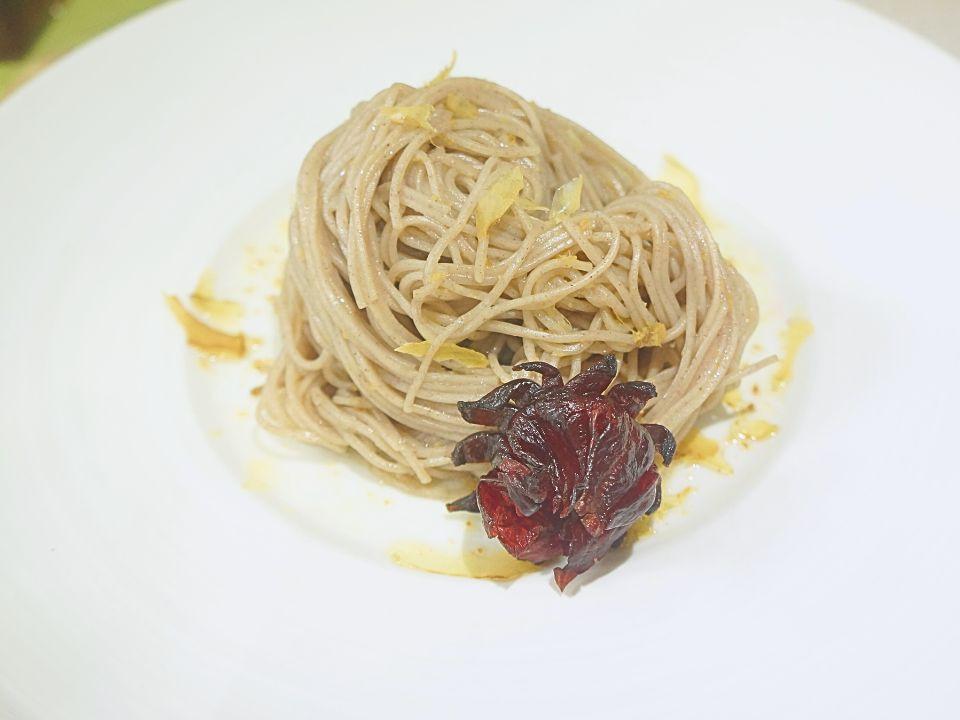3.放入碗中加入調味料1又1/4茶匙麻油薑、1又3/4茶匙洛神醋、1茶匙鰹魚醬油、1/4茶匙鹽巴